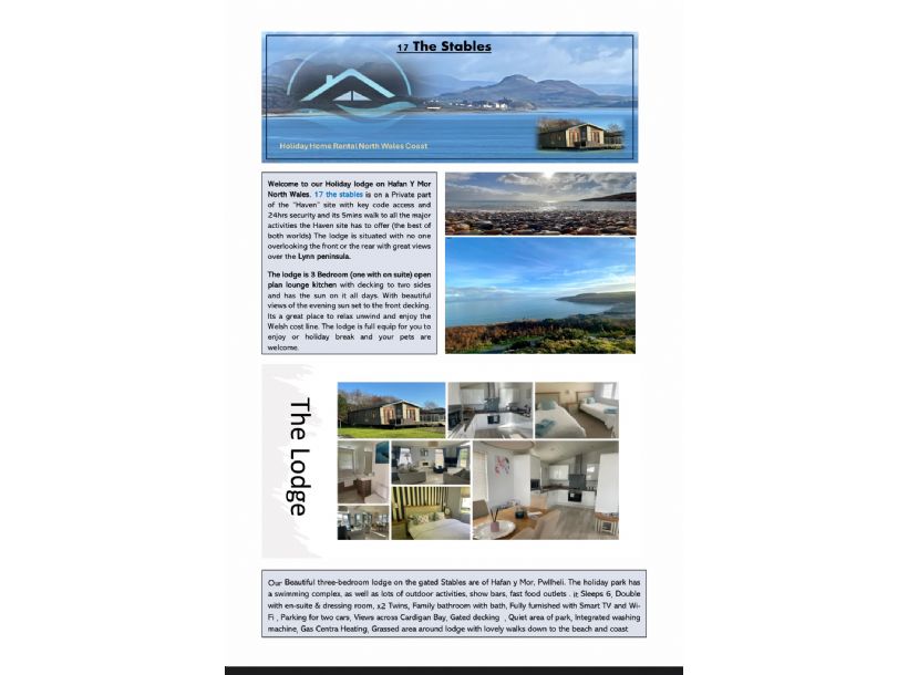 Welcome to our spacious Holiday lodge (20ft by 40ft), Set in one of North Wales Premuim holiday Parks . 17 the stables is on a Private part of the “Haven” Hafen y Mor site with key code access and 24hrs security and its 5mins walk to all the major activities on the Haven site and the private beach’s. . It has the best of both worlds with relaxing settings and close to activities . The lodge is situated with no one overlooking the front or the rear with great views over the Lynn peninsula. With beautiful private wrap around decking that has the sun on it all day. We pride ourselves in having everything you need in our holiday home from home - we have 5 star feedback all though 2025 and will ensure you have a lovely family stay