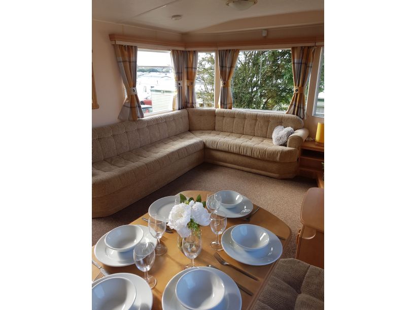 Our 3 bedroomed heated caravan is our pride and joy, The large patio area enables you to have your meals outside whilst enjoying the stunning views, there is an outside seating area. The caravan is fully equipped with everything you need, beautiful coordinated upholstery, it has a walk in large size shower with bath bottom for the younger kids wc and sink, all that is needed is your own bed linen, towels and t towels, there are ample cleaning products and we ask you please to leave the caravan as beautifully as you found it on your arrival ready for the next guests